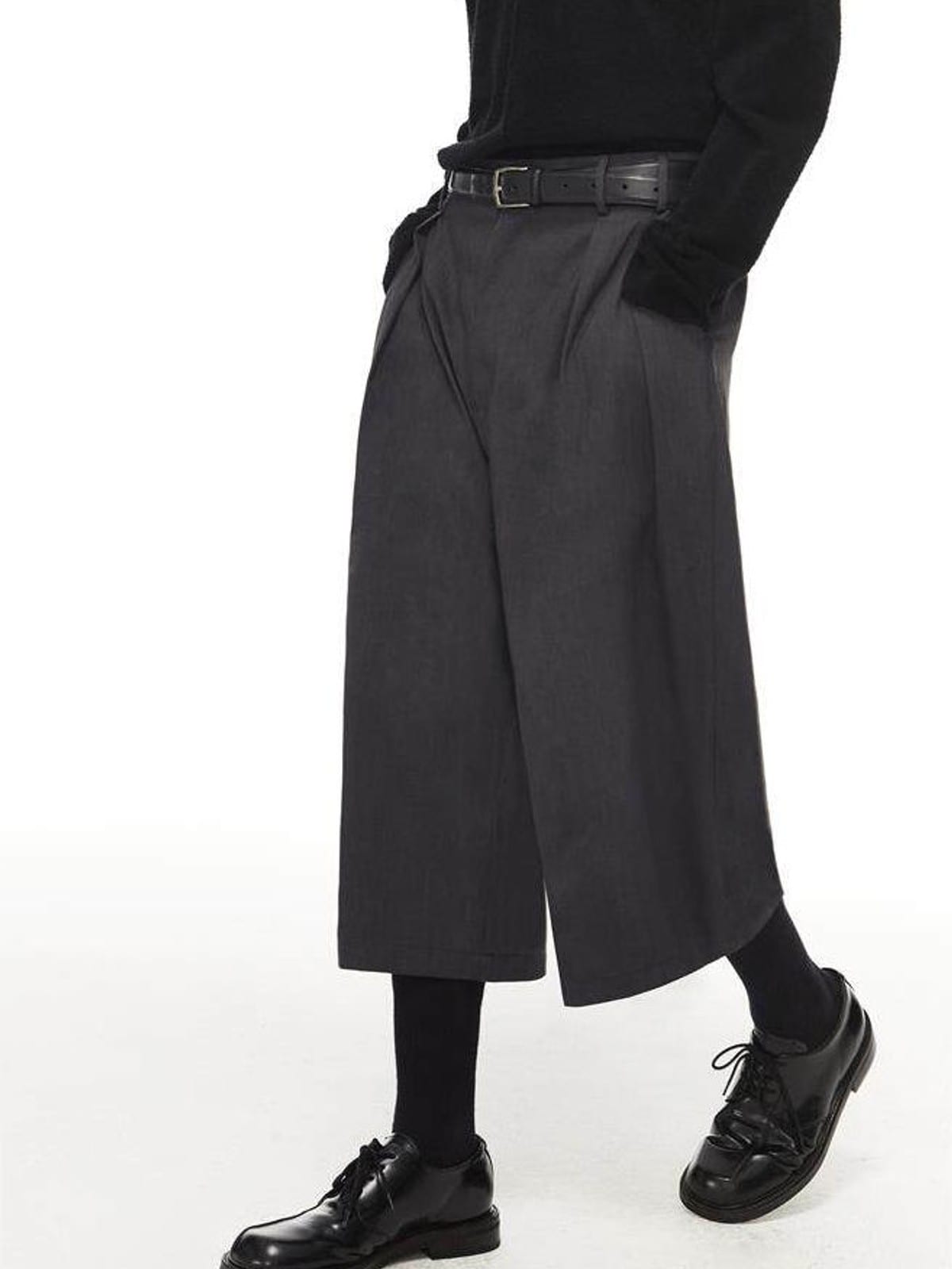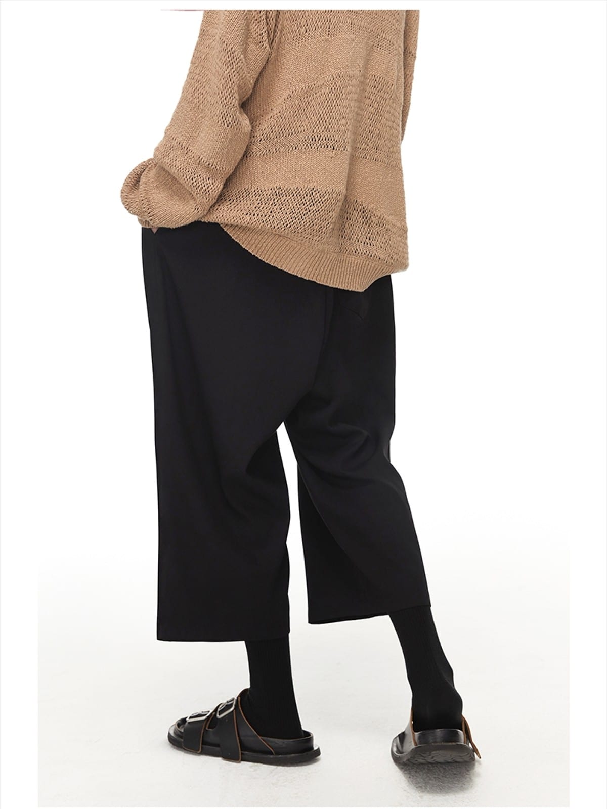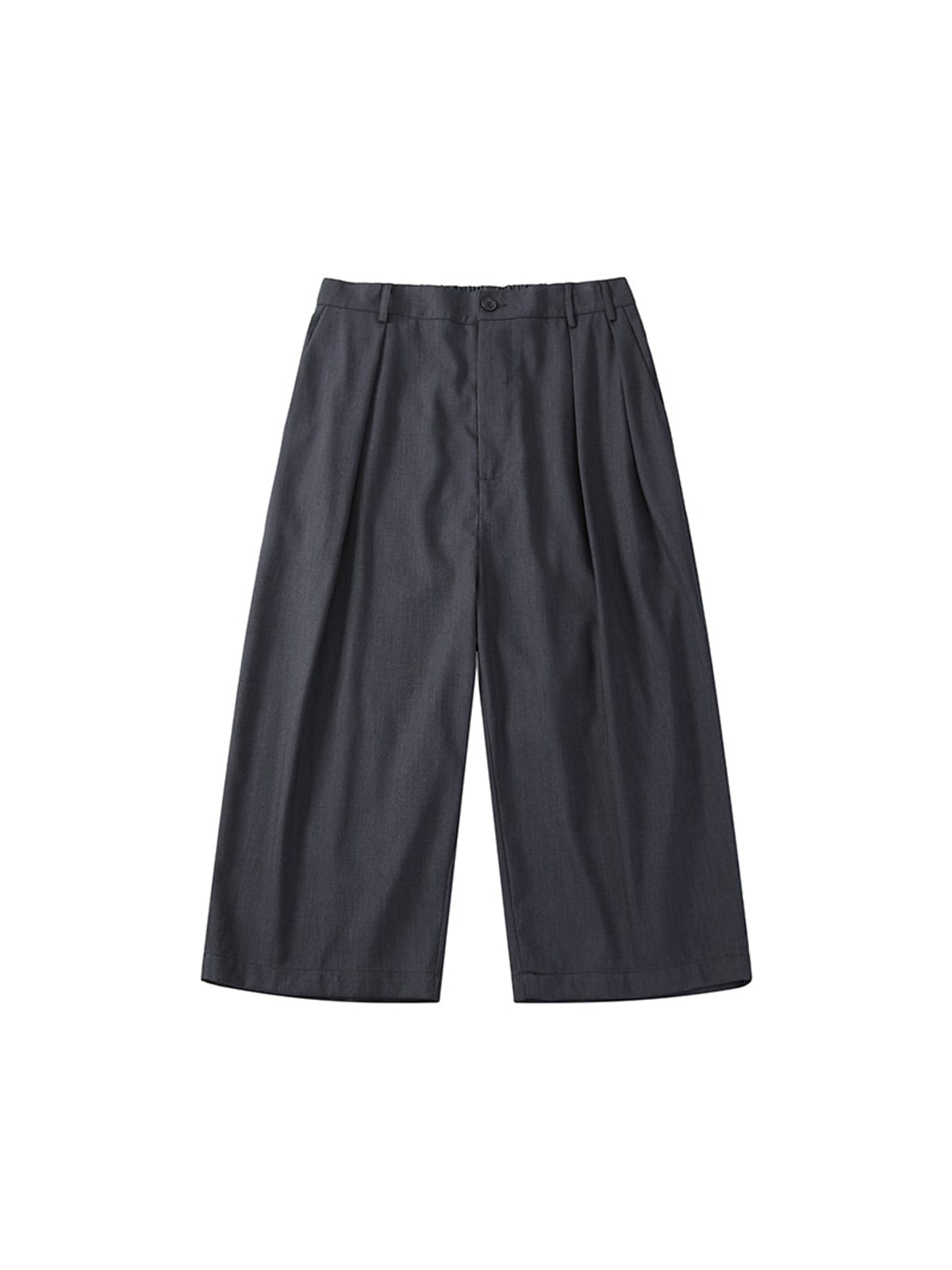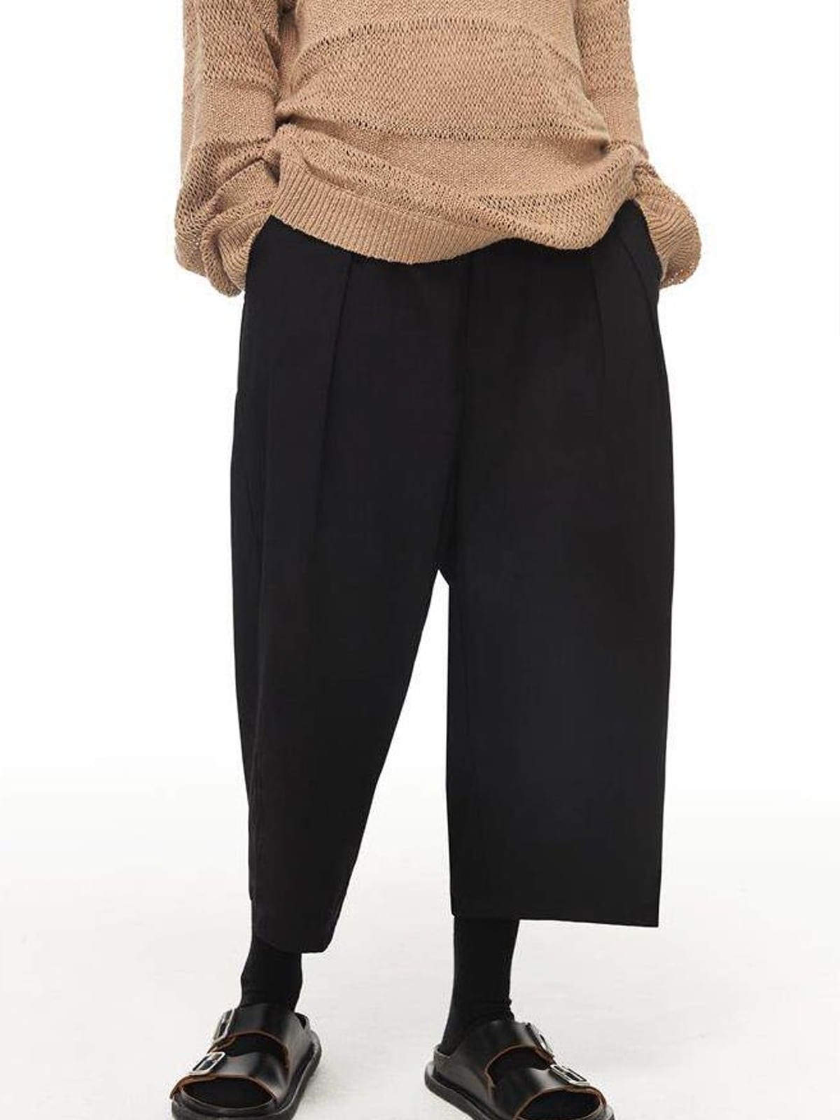 SIMPLE PROJECT's cropped trousers in a lightweight polyester-rayon blend. Front pleats, belt loops, side slip pockets, and a clean finished hem.