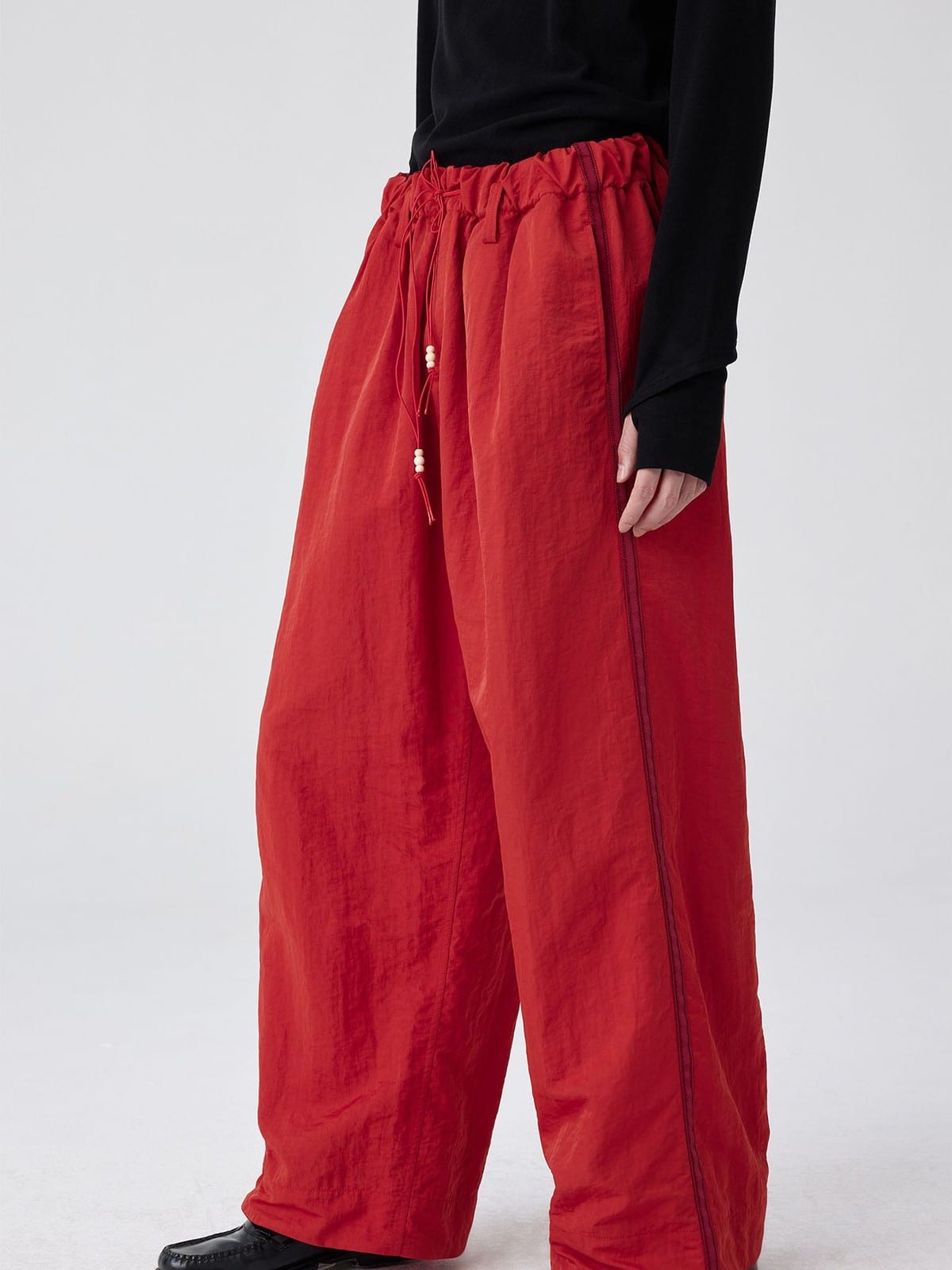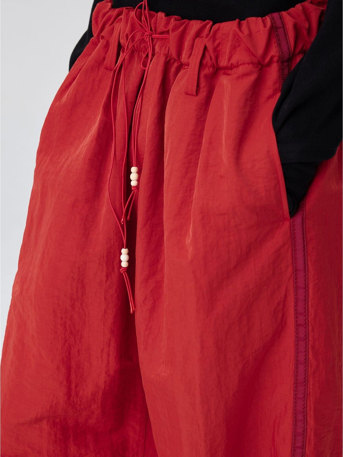 SIMPLE PROJECT's wide-leg trousers in 100% nylon. Detailed with an elasticated waist, adjustable front drawstring, side seam pockets, and a full-length hem.