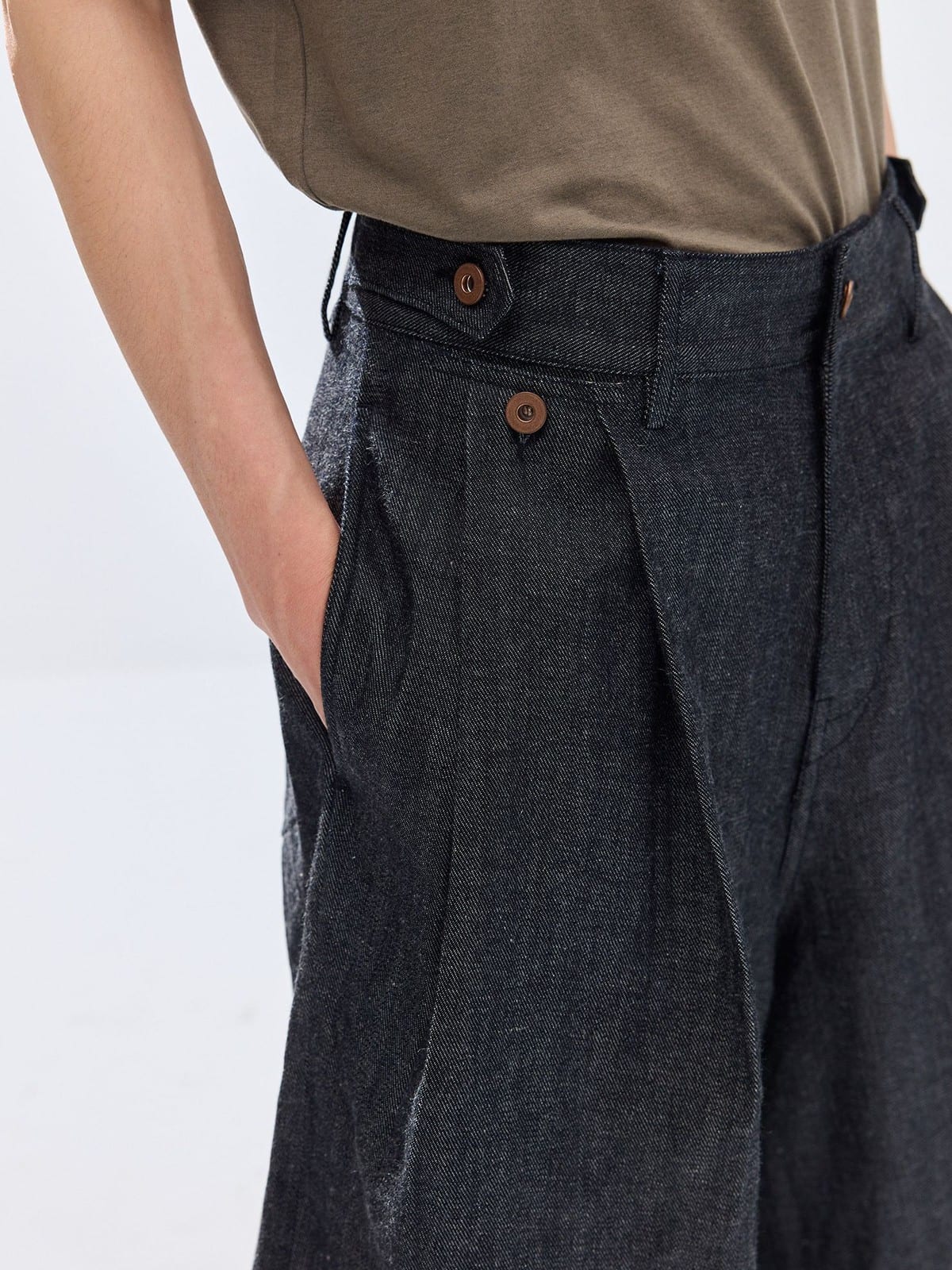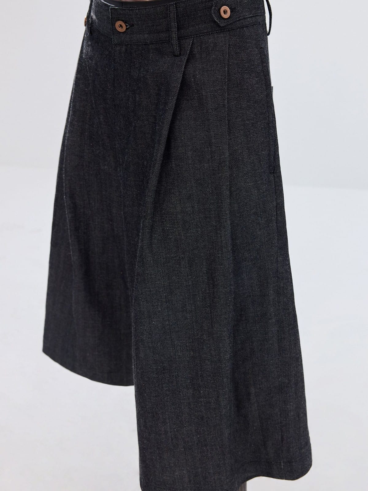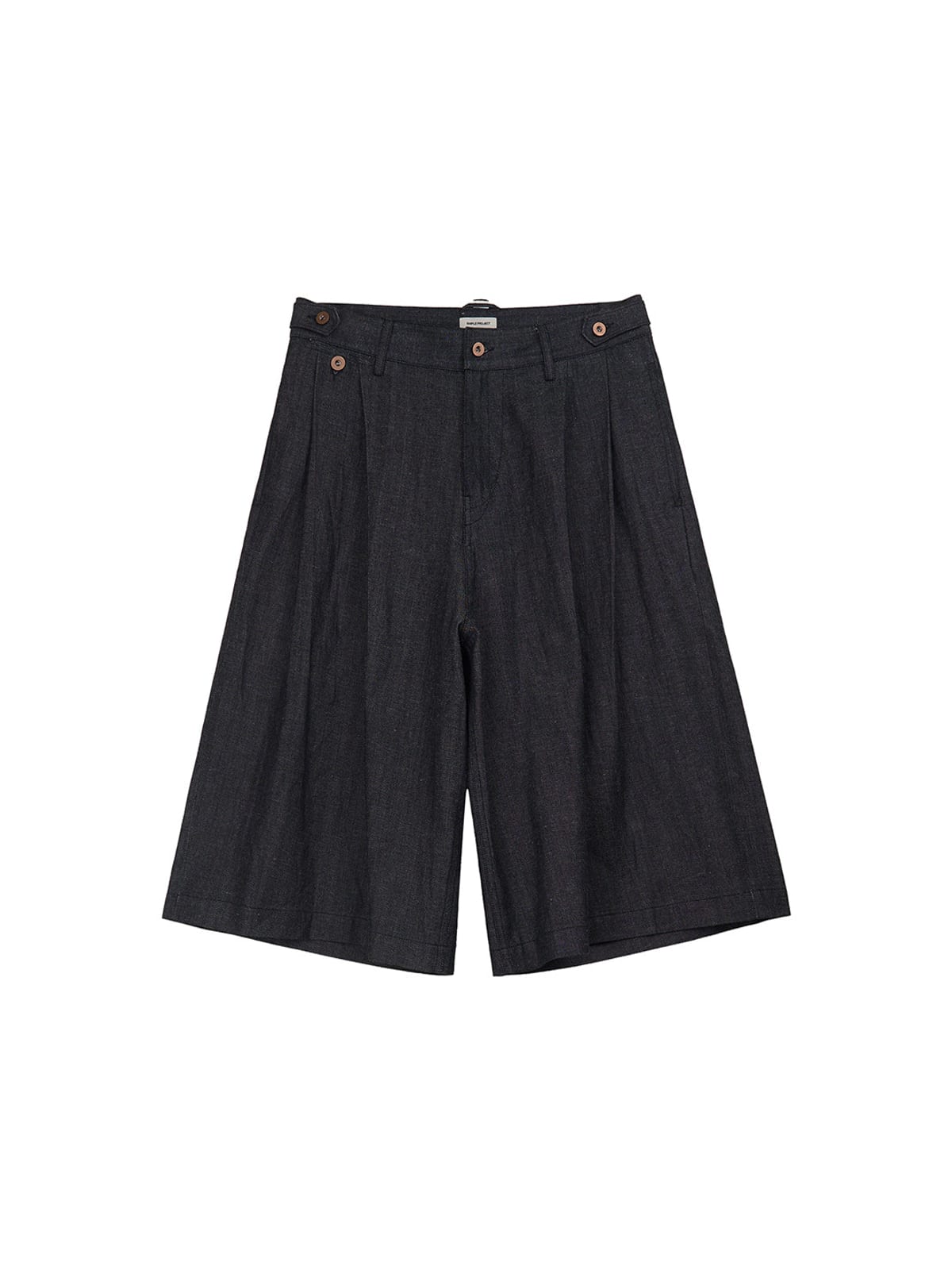 SIMPLE PROJECT's wide-leg cropped shorts in lightweight cotton and ramie-blend raw selvedge denim. Features a drawstring waist, pleated front, and mid-calf length.