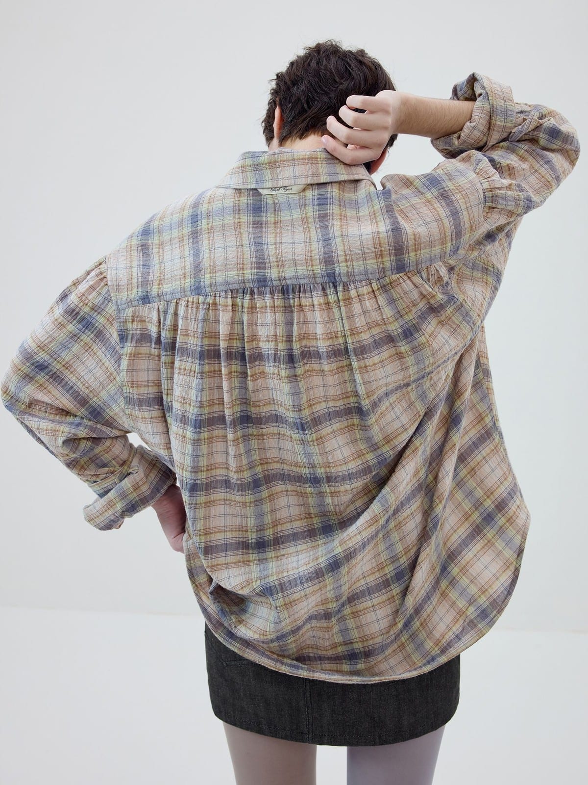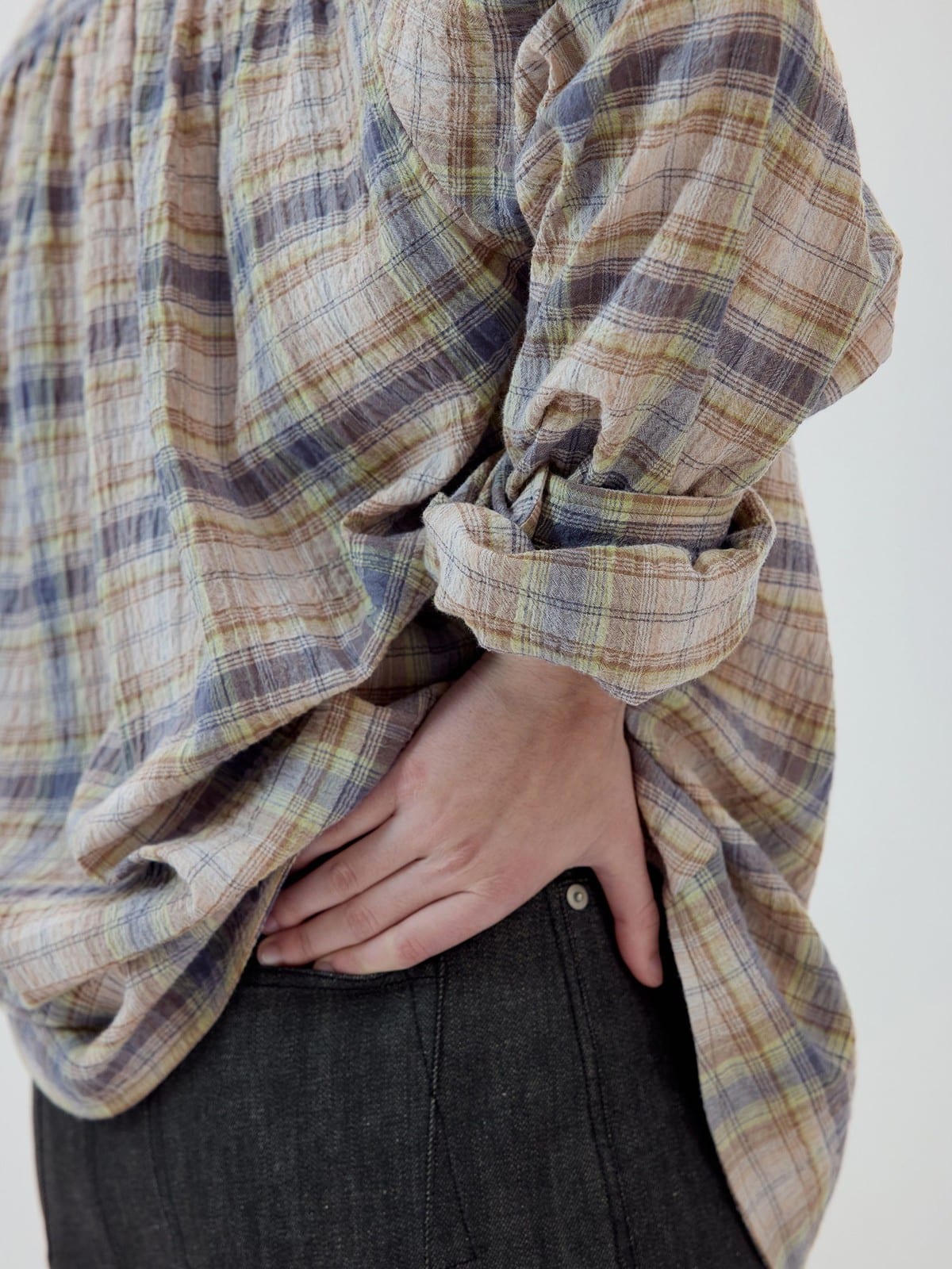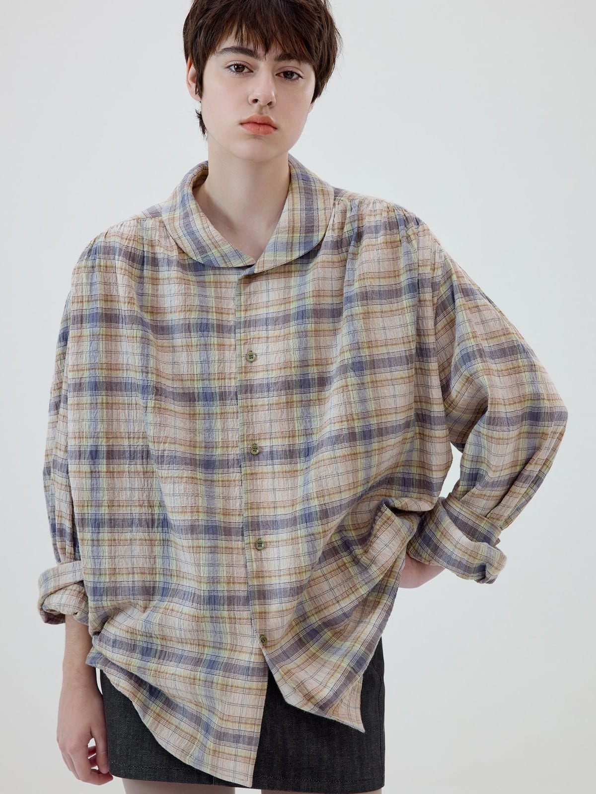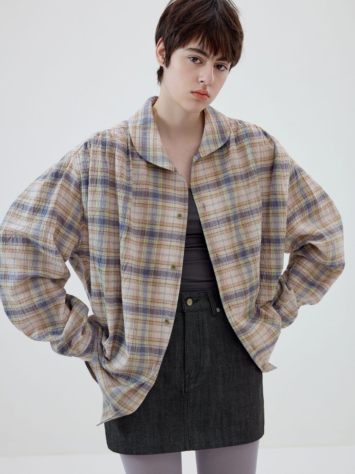 SIMPLE PROJECT's crinkled plaid shirt in a 99% cotton blend. Features a rounded shawl collar, button-front closure, and subtle ruched detailing at the shoulder seams.