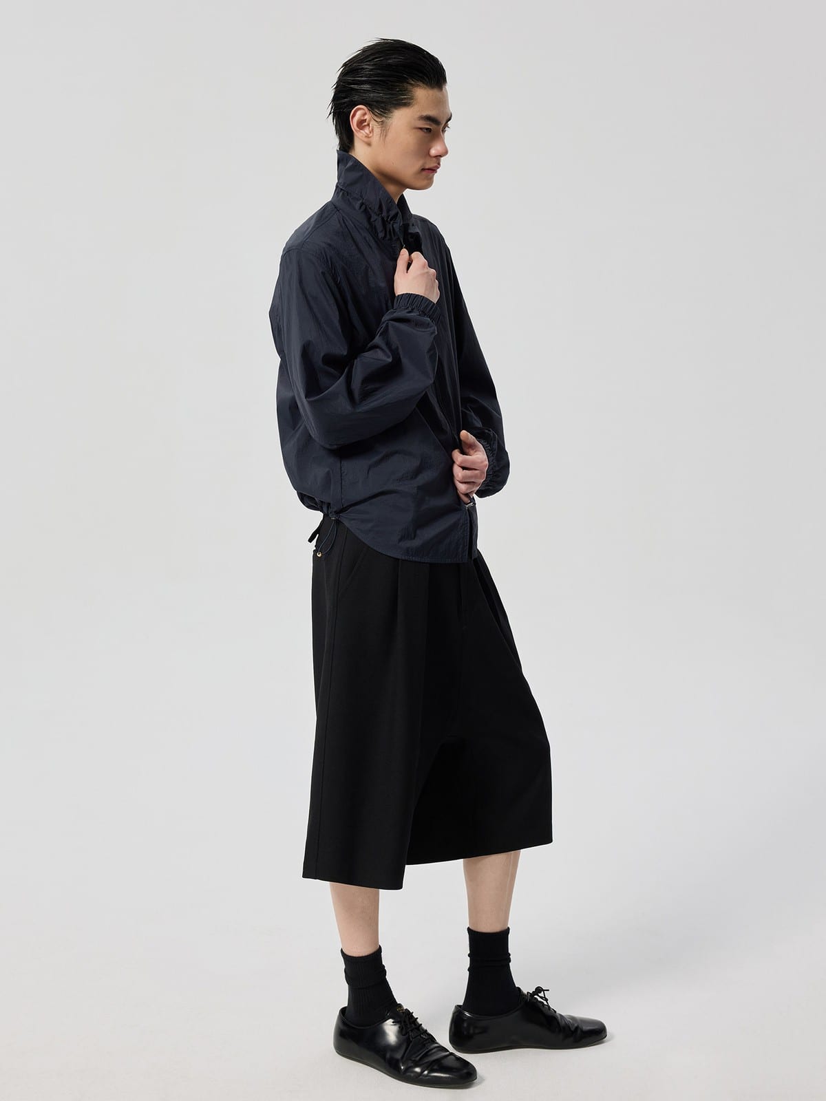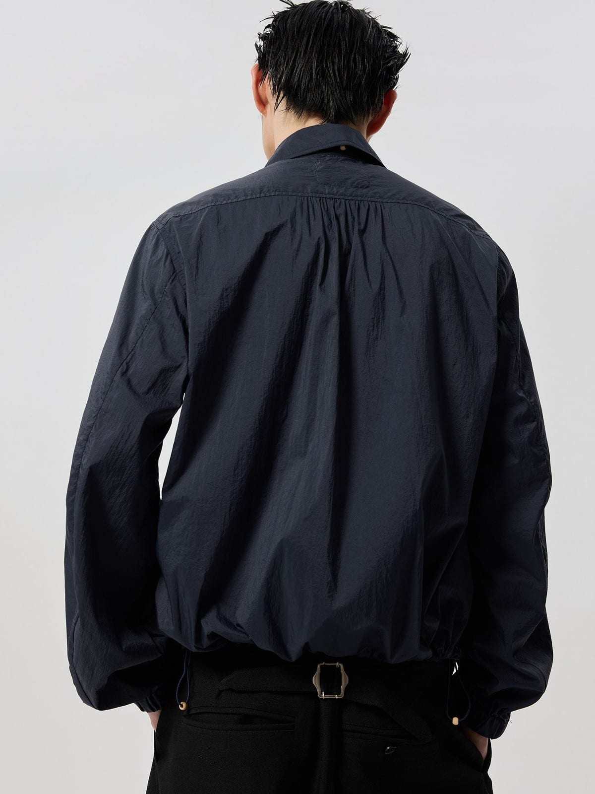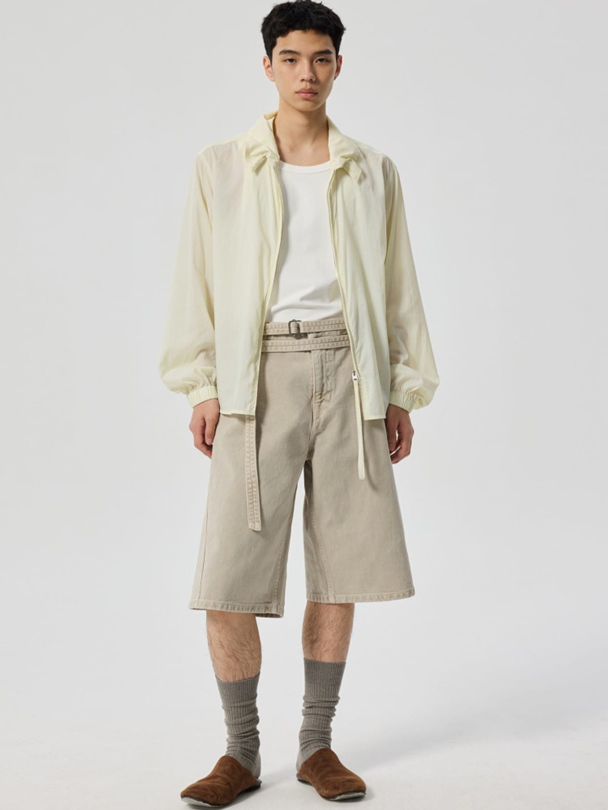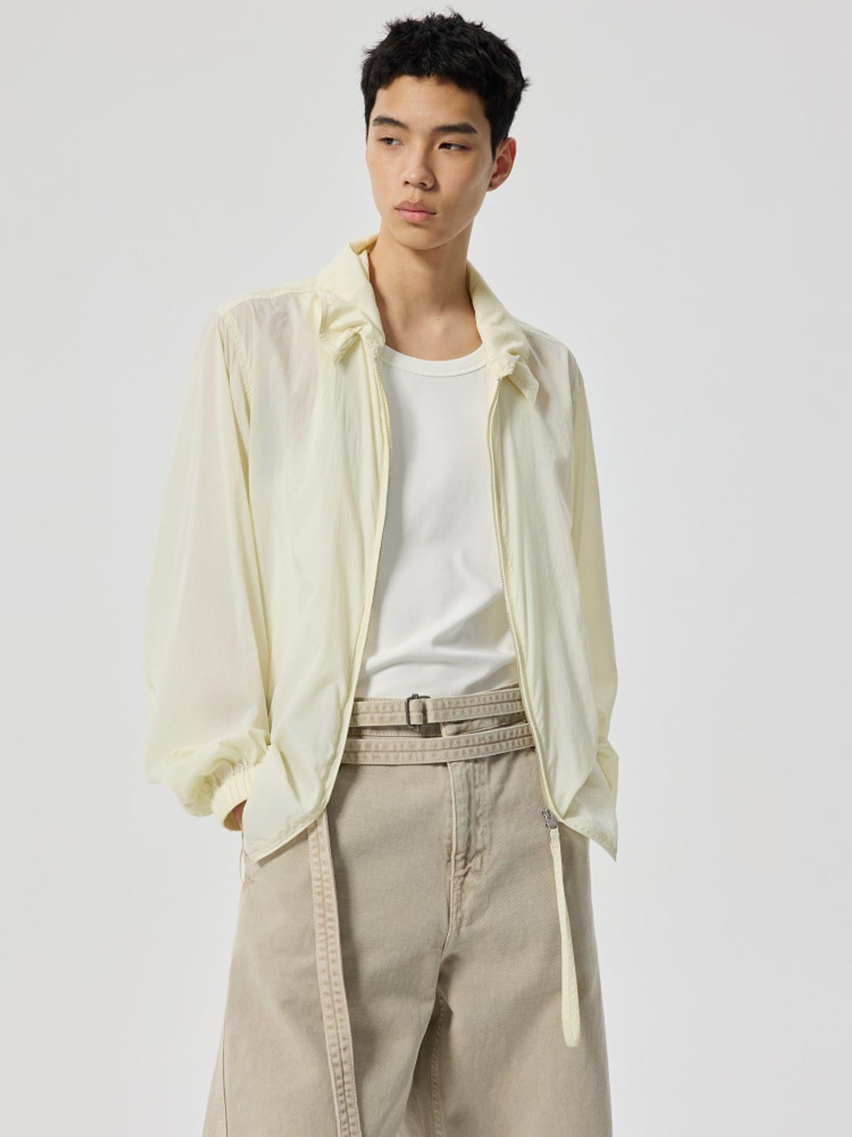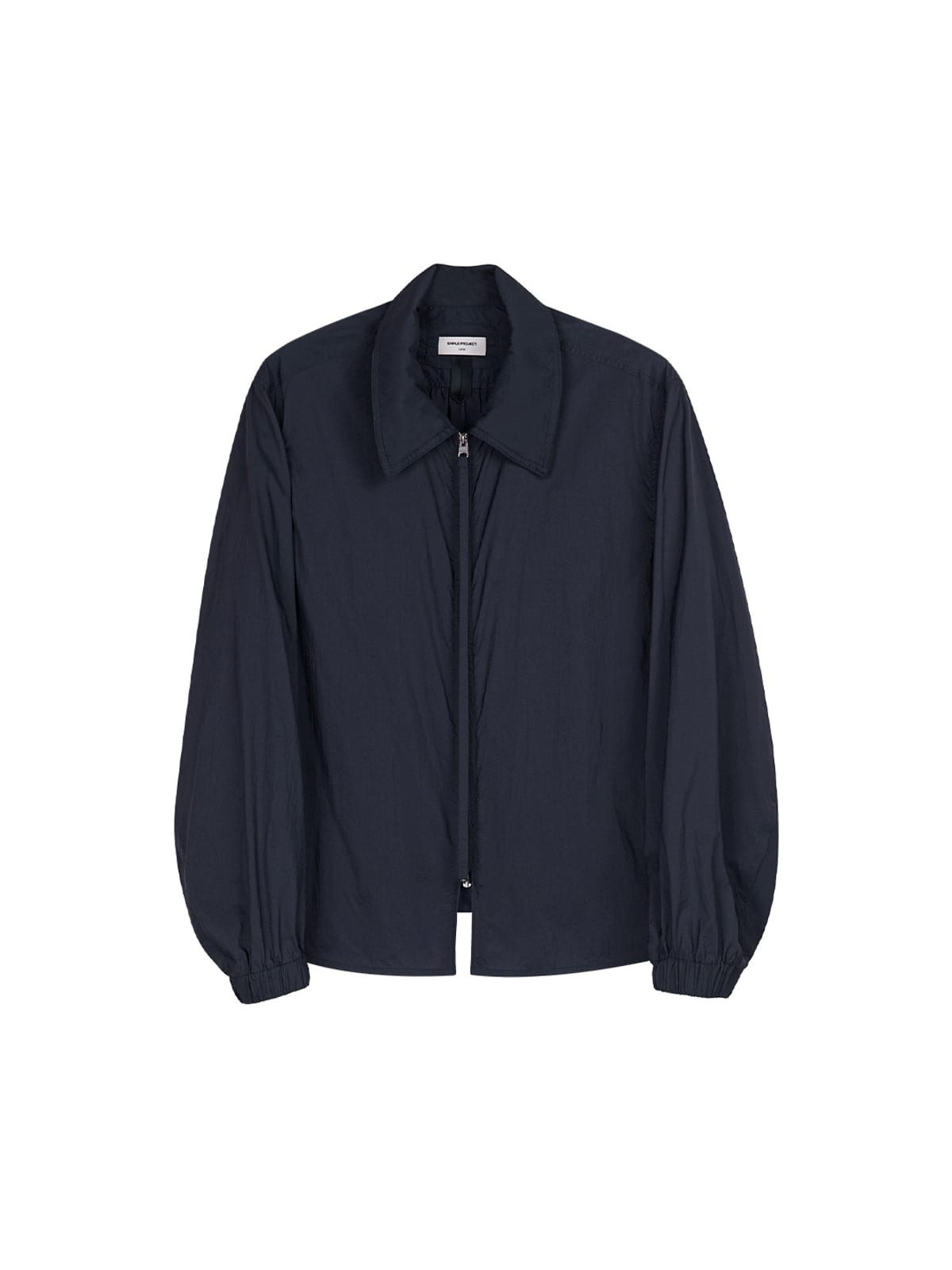 SIMPLE PROJECT's lightweight UV protection overshirt crafted in sheer 100% nylon. Features a classic point collar, full zip-front closure, and gathered elastic cuffs.