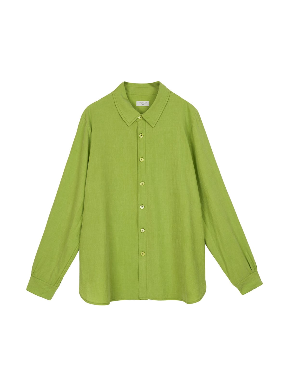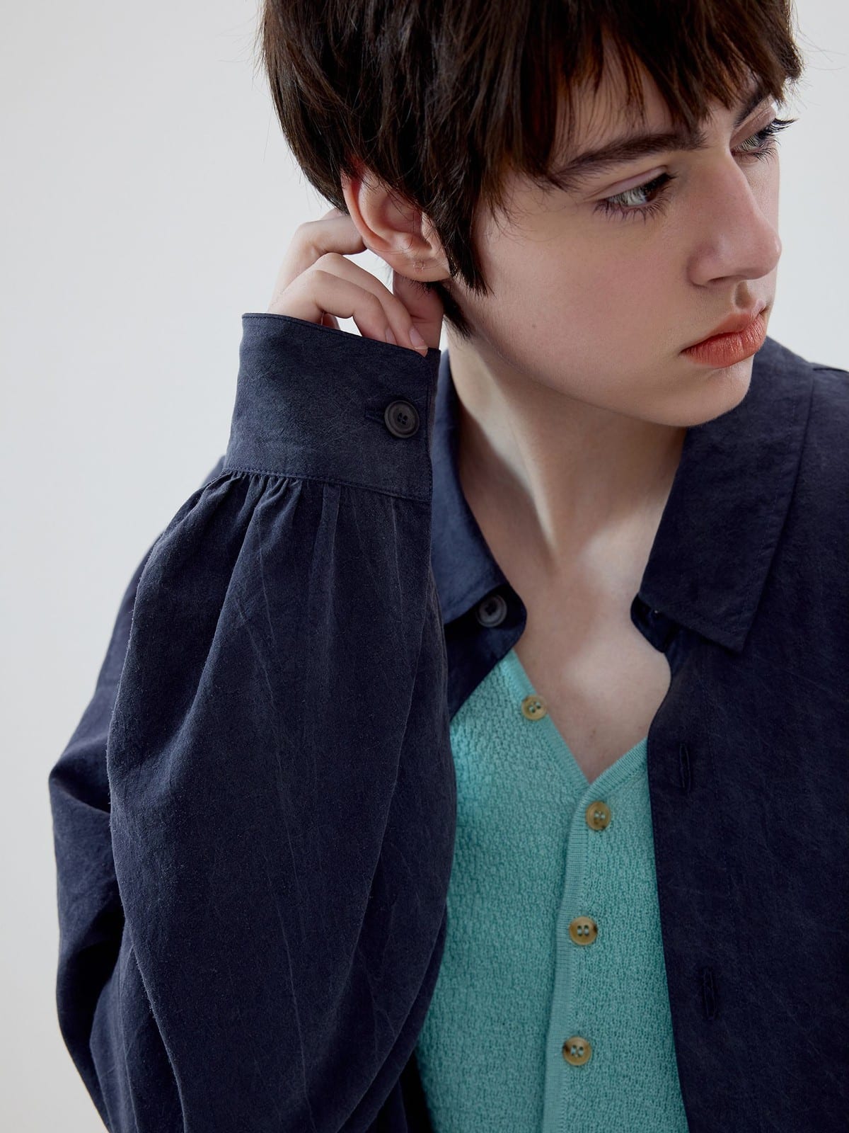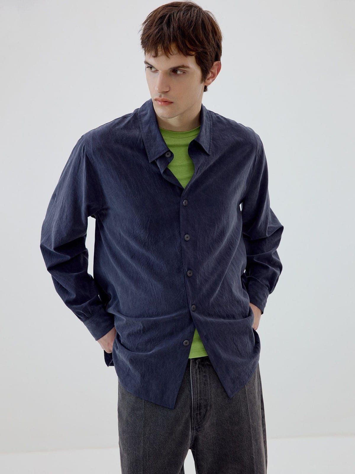 SIMPLE PROJECT's washed long-sleeve shirt in 100% Lyocell. Features a classic point collar, button-up front closure, and uniquely gathered details at the buttoned cuffs.