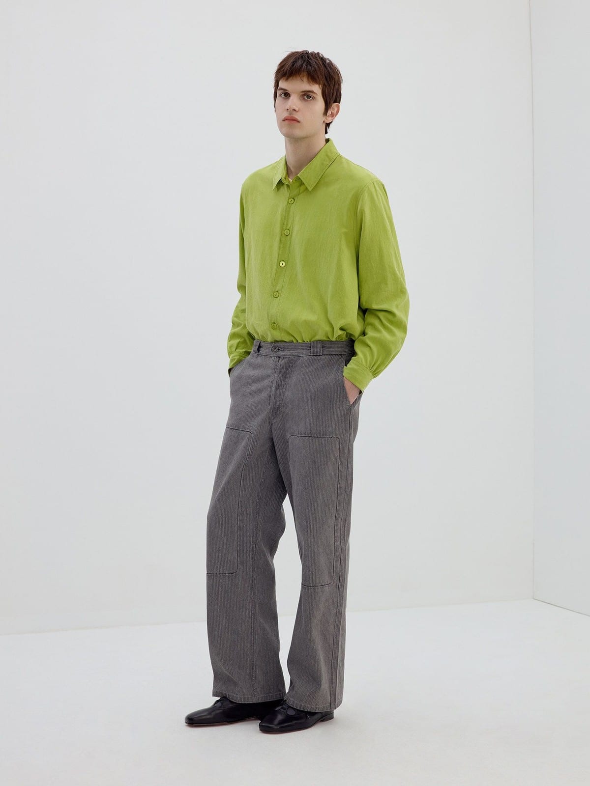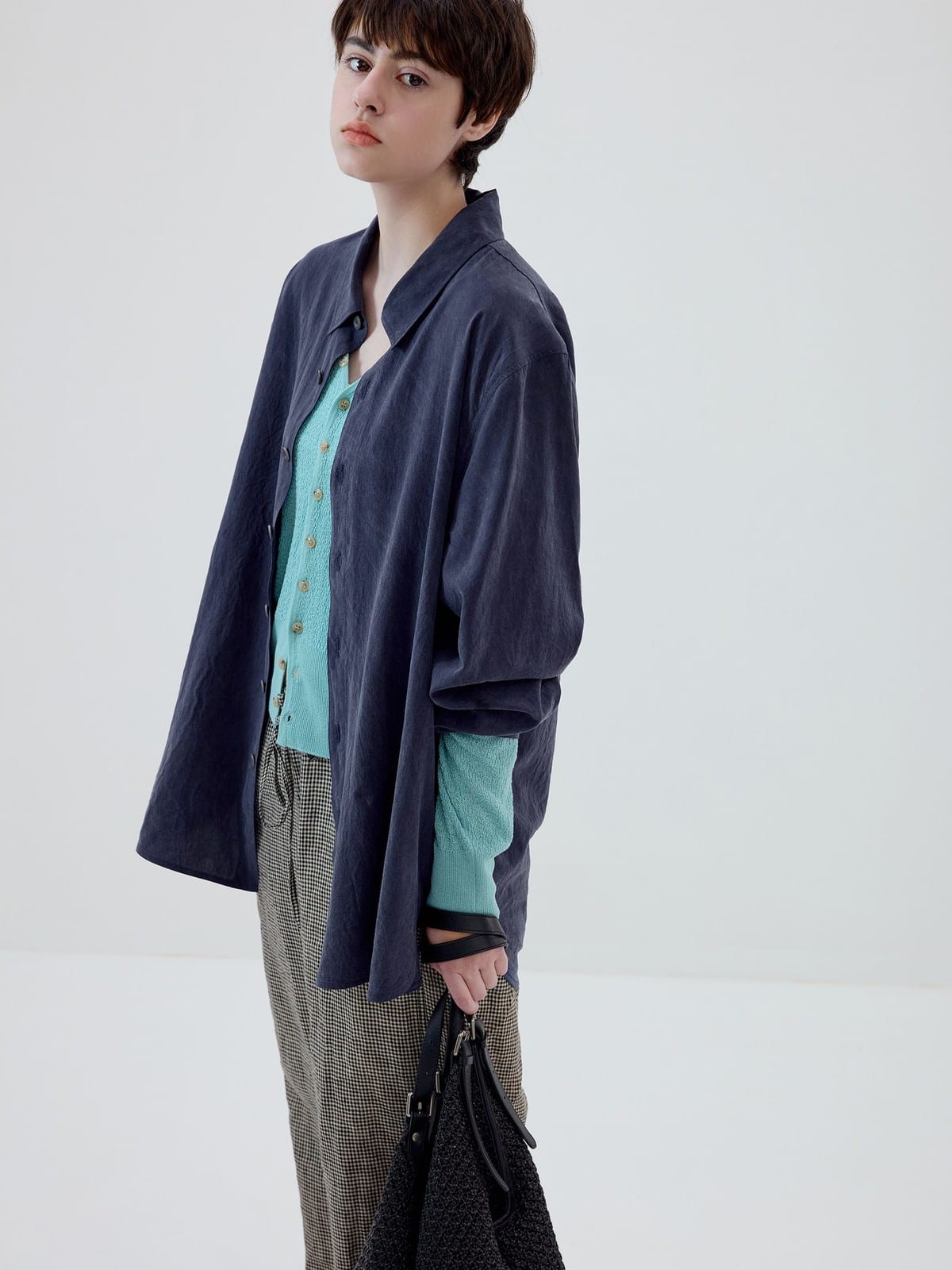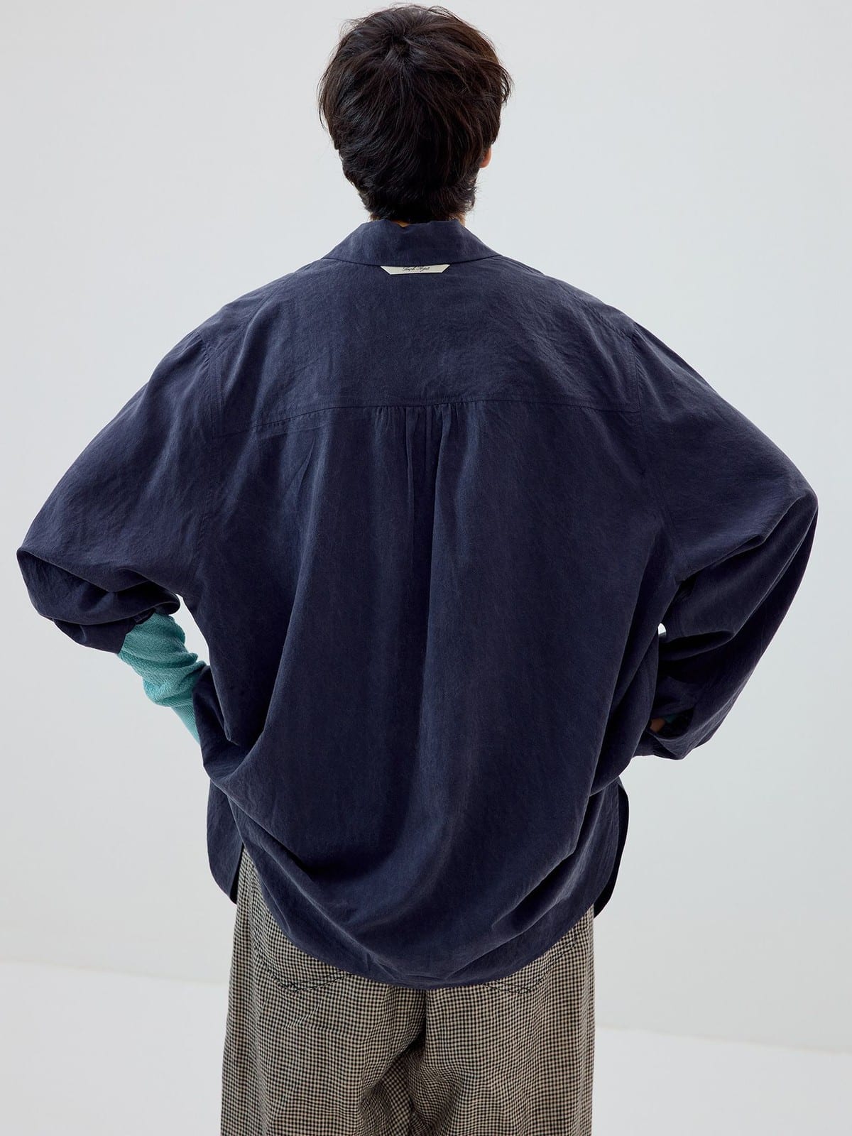 SIMPLE PROJECT's washed long-sleeve shirt in 100% Lyocell. Features a classic point collar, button-up front closure, and uniquely gathered details at the buttoned cuffs.
