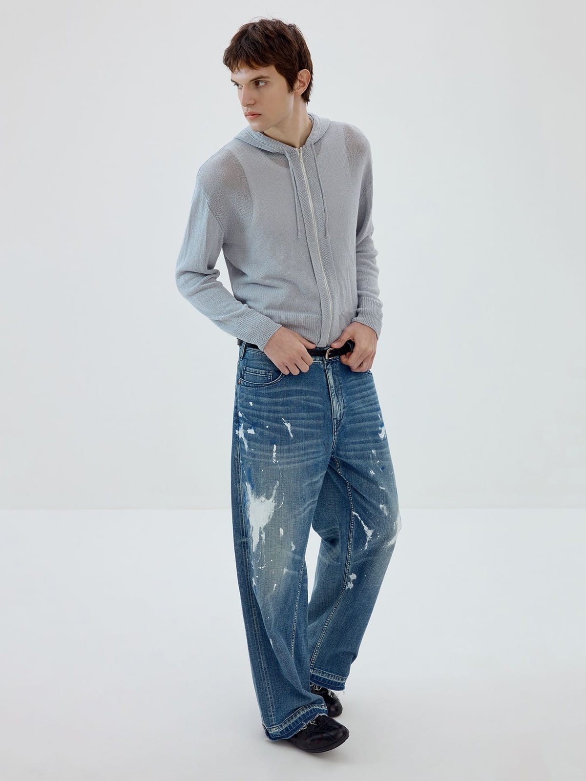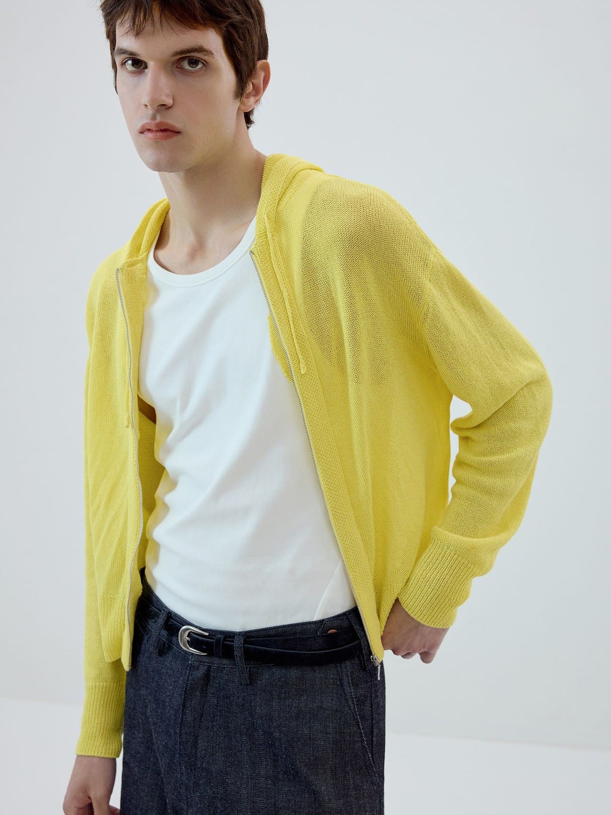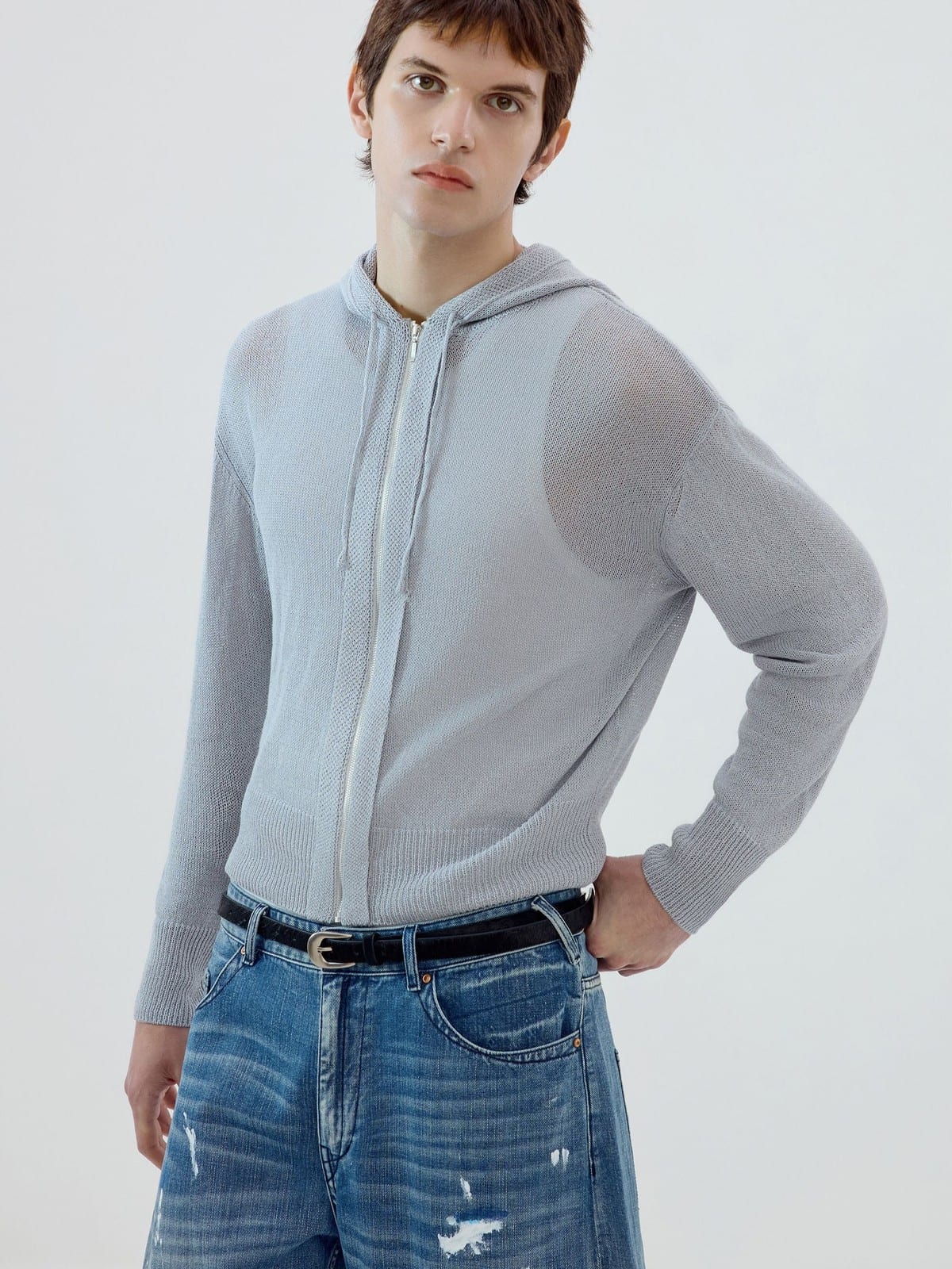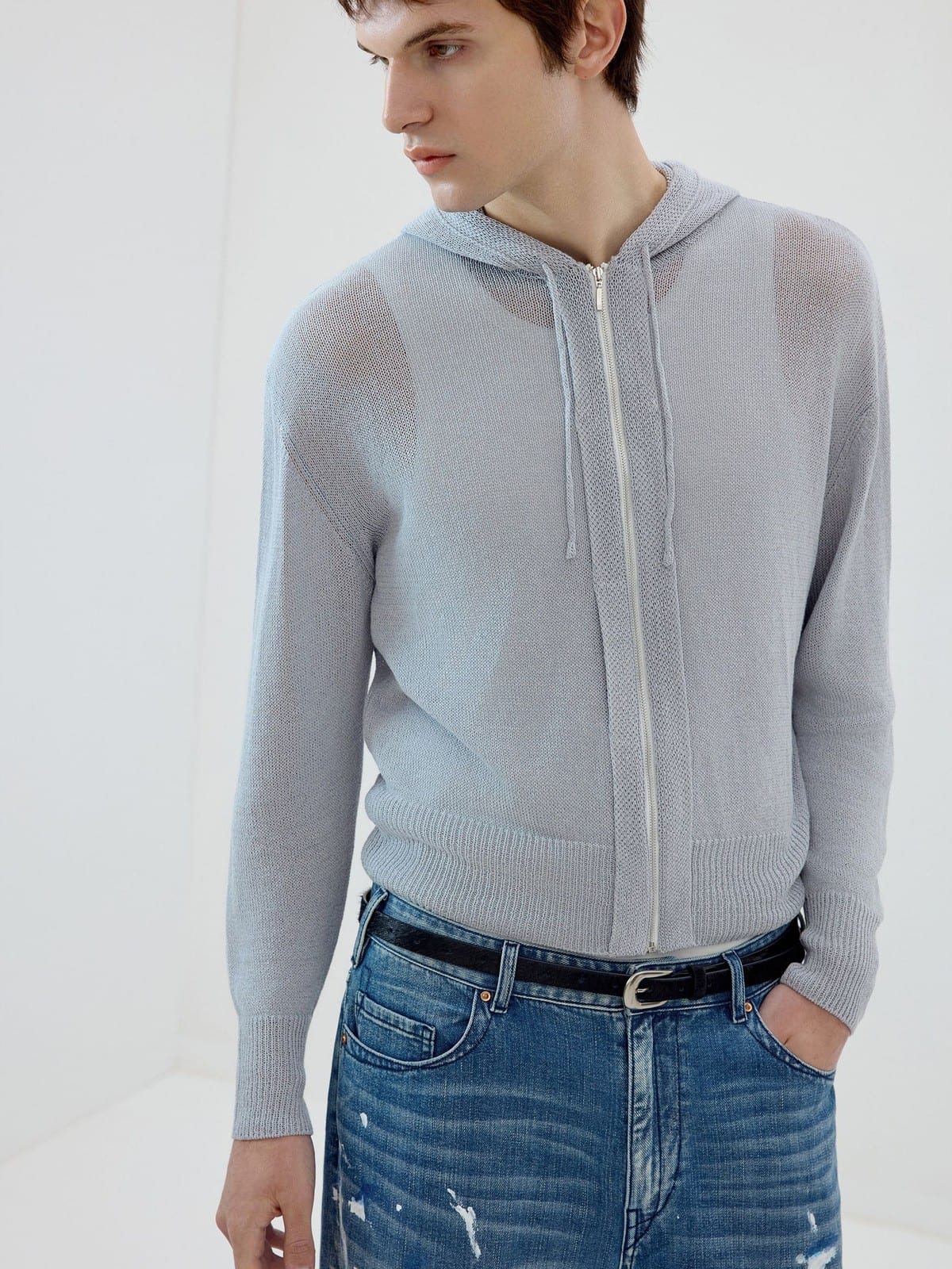 SIMPLE PROJECT's lightweight hoodie in a washi paper and viscose-blend knit. Features a drawstring hood, front zip closure, and ribbed cuffs and hem.